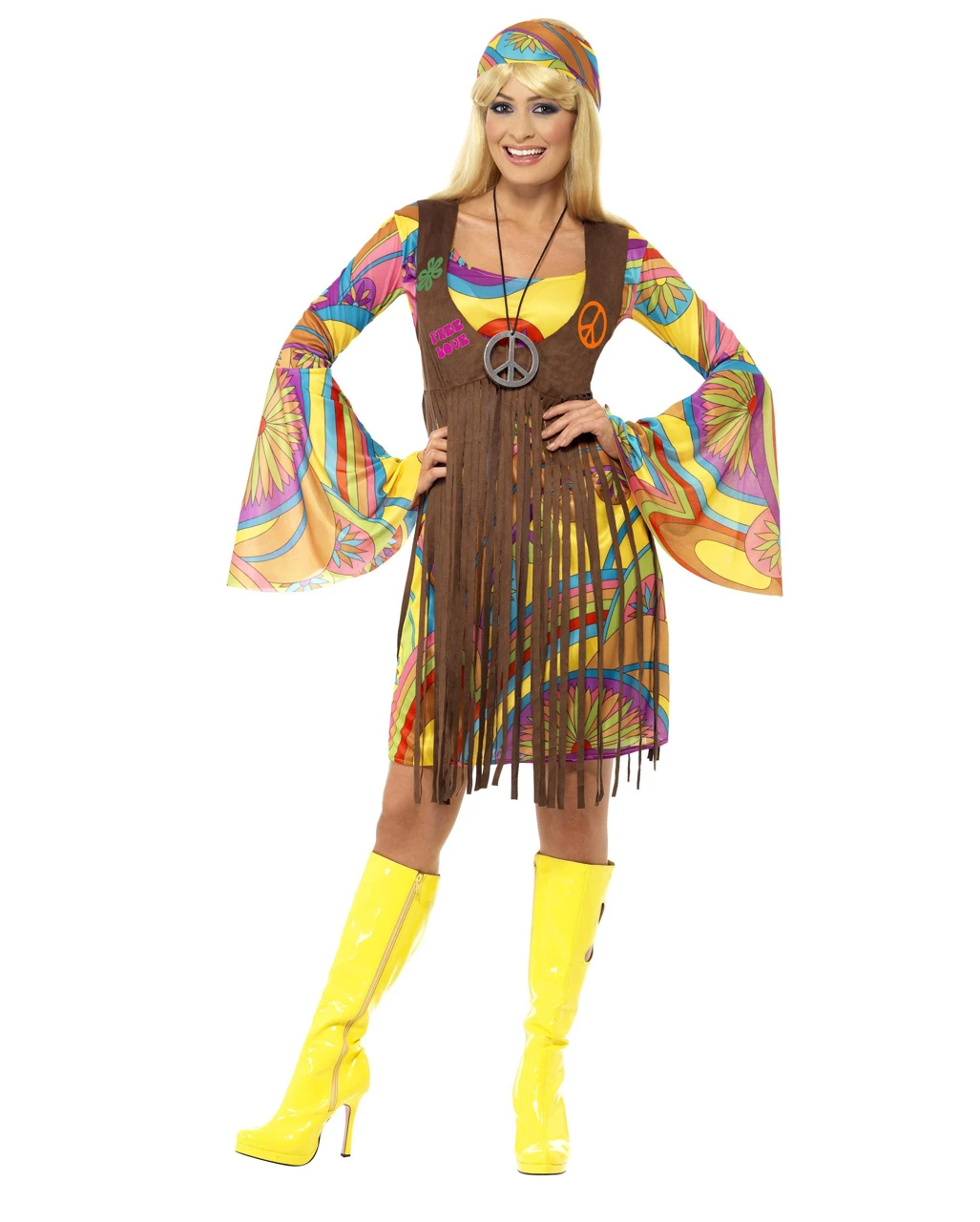 Für ein 60s Kostüm mit prächtigen Farben empfehlen wir dir unser heißbegehrtes 60er Jahre Hippie Kostüm mit Fransenkleid. Die Woodstock Damen Verkleidung weist typische Elemente der 60er Jahre auf und macht aus jeder Kostümparty ein Festival des Friedens. Werde zur hübschen Hippie-Braut und trage das Frauen Hippiekleid mit Fransen und passendem Stirnband.