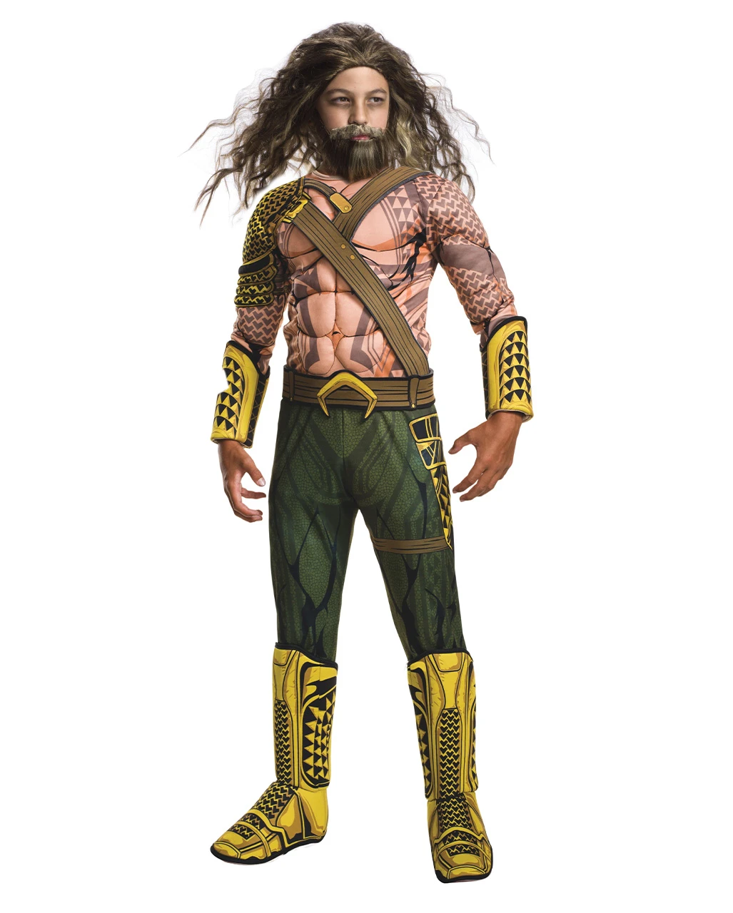 Das Aquaman Kinderkostüm besteht aus einem hautfarbenen Jumpsuit mit olive-farbenen Applikationen. Am Oberkörper sind Muskeln, Fischschuppen und ein Gurt abgebildet. Der untere Bereich hat die Optik einer Hose. Angebrachte gelbe Schuhüberzieher und ein Gürtel runden das Aquaman Kostüm für Kinder perfekt ab. Auch Erwachsene finden mit unserem Aquaman Deluxe Herrenkostüm die passende Verkleidug.
