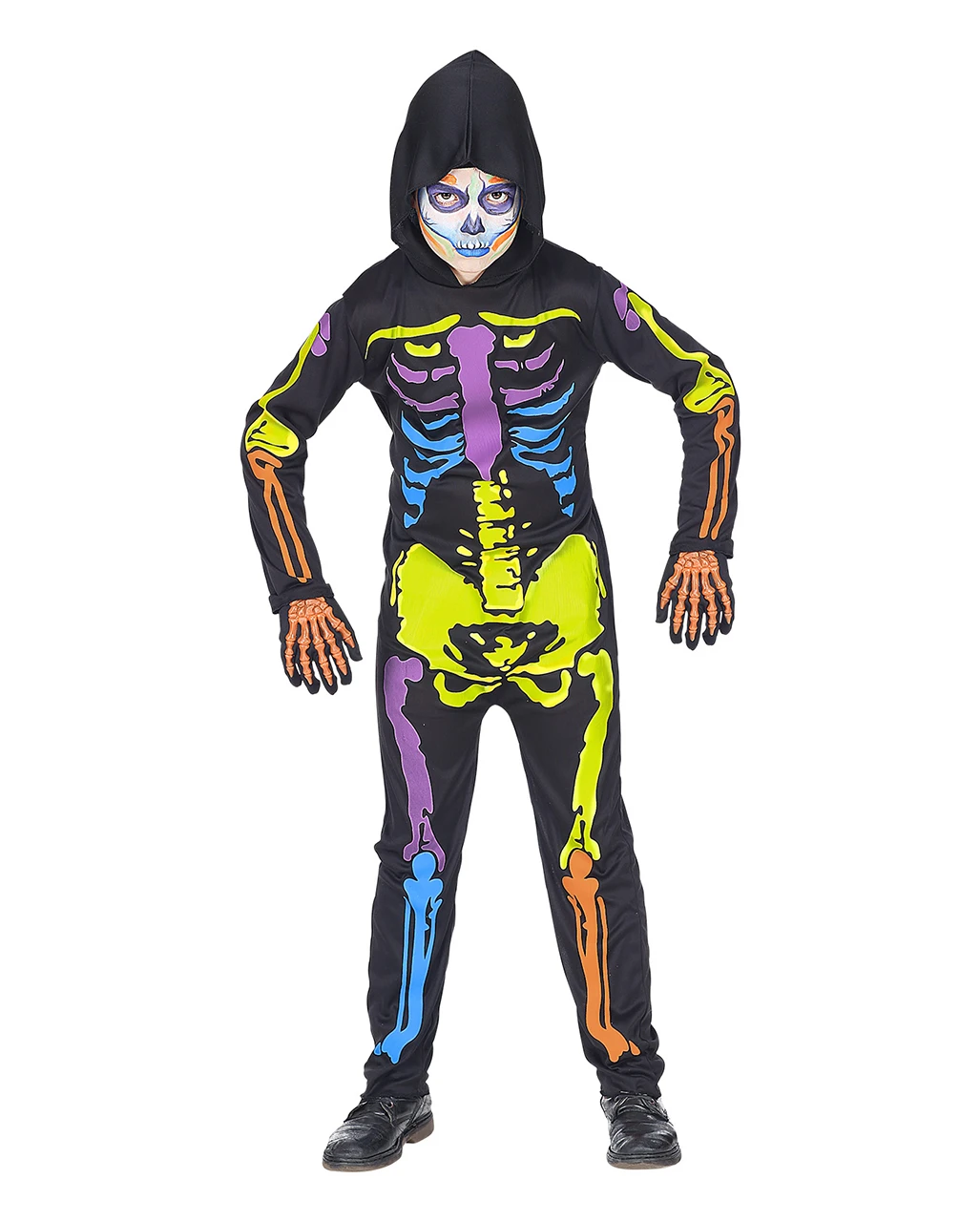 Der Bunte Skelett Overall für Kinder besteht zu 100% aus Polyester. Der Einteiler ist mit auffälliger Farbe bedruckt und hat eine angenähte Kapuze. Das Kostüm ist von 2 Jahre bis 10 Jahre erhältlich und somit für alle Kinder geeignet. Zum Bunten Skelett Overall für Kinder passt auch unser Zubehör wie das Professionelles Creme Make-Up Weiß und das Skull Make Up Komplett Set.