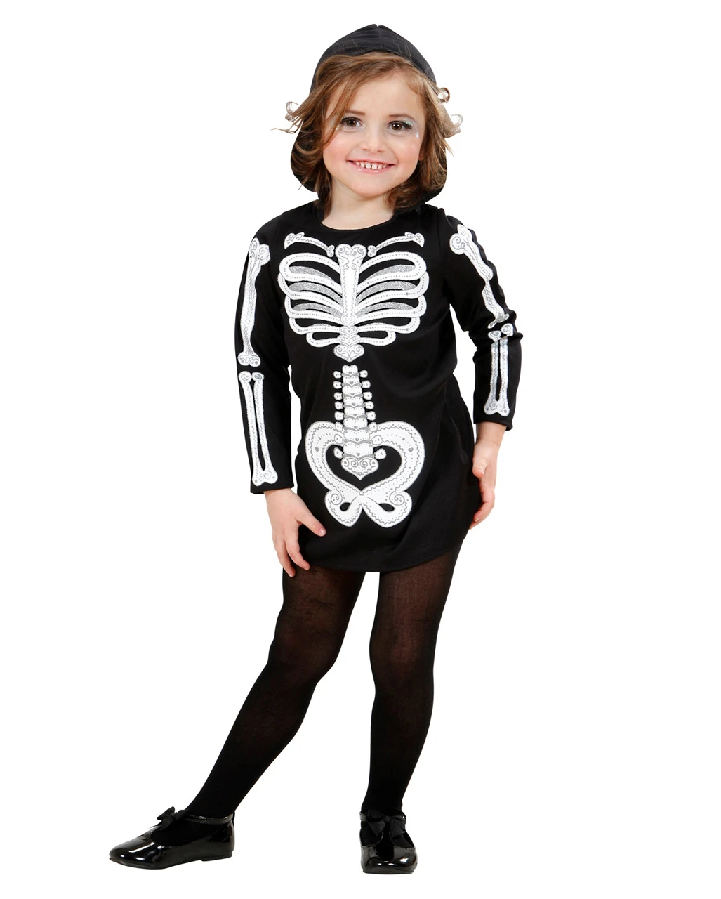 Das Glamour Skelett Mädchenkostüm ist ein zauberhaftes Halloween Kleinkinderkostüm für den ersten Trick or Treat. Das niedliche Kostüm mit Kapuze zeigt einen Knochenprint, der ganz mädchenhaft glitzert. Wahrscheinlich handelt es sich bei dem Skelett um die Knochen einer Märchenprinzessin und die Gute glitzert über den Tod hinaus. Für eurer Kleine ist das Kinder Kostüm jedenfalls eine fabelhafte Idee, um in der Halloween Nacht zu glänzen und viele Süßigkeiten einzuheimsen.
