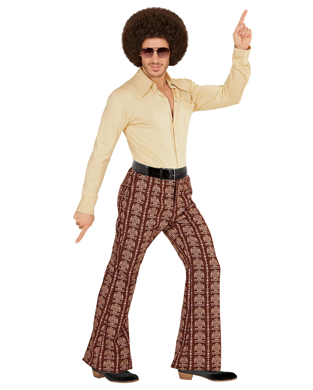 Kein Wunder. Der funky Look hat es eben einfach in sich, wo immer Du die geniale Groovy 70er Herren-Schlaghose Old School auch trägst. Sie ist außerdem wirklich angenehm zu tragen. Das auffällige Muster ist im typischen Style einer 7oer Jahre und der Schlag macht in jedem Fall ein schlankes Bein. Die Farbe ist ein kräftiges Braun, das Muster wurde in beige und weiß gehalten. Kombinierbar ist die gemusterte Hose besonders toll zum einem knalligen Hemd und anderen coolen Accessoires im 70er Styling, die Du Dir bei uns im Shop aussuchen kannst. Wie wäre es mit einem 70er Jahre Groovy Hemd orange und einer Afro Perücke Braun?