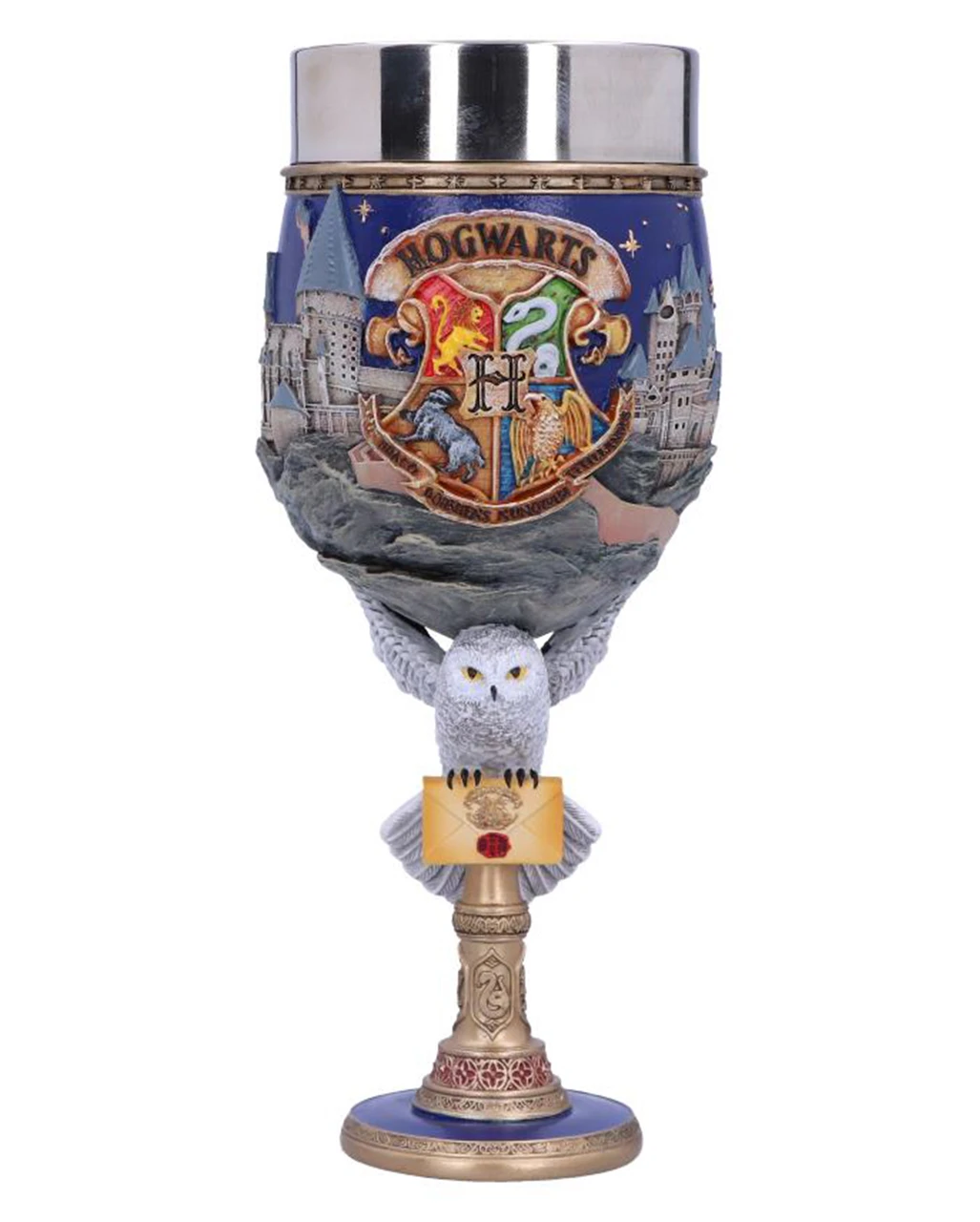 Der Harry Potter Hogwarts Weinkelch ist ein Must-have für alle Fans der magischen Geschichten aus Hogwarts. Mit diesem offiziell lizenzierten Hogwarts Kelch zeigst du als Sammler deine Leidenschaft für die weltbeste Schule für Hexerei und Zauberei. Damit jeder gleich erkennt, um was für ein magisches Trinkgefäß es sich handelt, präsentiert der Pokal das Hogwarts-Wappen mit den vier Häusern Gryffindor, Slytherin, Hufflepuff und Ravenclaw, das von einer 3D-Landschaft der Schule Hogwarts selbst flankiert wird. Unterhalb des Schlosses bildet Hedwig, die weiße Eule, die Spitze des Stiels und trägt einen Hogwarts-Aufnahmebrief einen wunderbaren Abschluss.