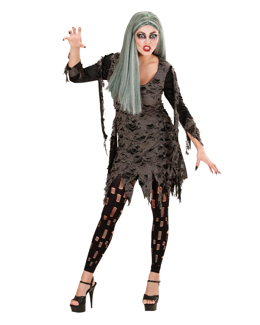 Das Living Dead Zombie Frauenkostüm ist die ideale Verkleidung für Halloween oder die Walking Dead Motto Party. Das grauschwarze Zombie Kleid weist den angesagten Fetzenlook auf. Aber nicht nur deshalb ist das Zombie Damen Kostüm das perfekte Halloween Kostüm. Die passende löcherig aussehende Leggings komplettiert den Walking Dead Look. Für das Gesicht empfehlen wir die Zombie Fraß Latexwunde.