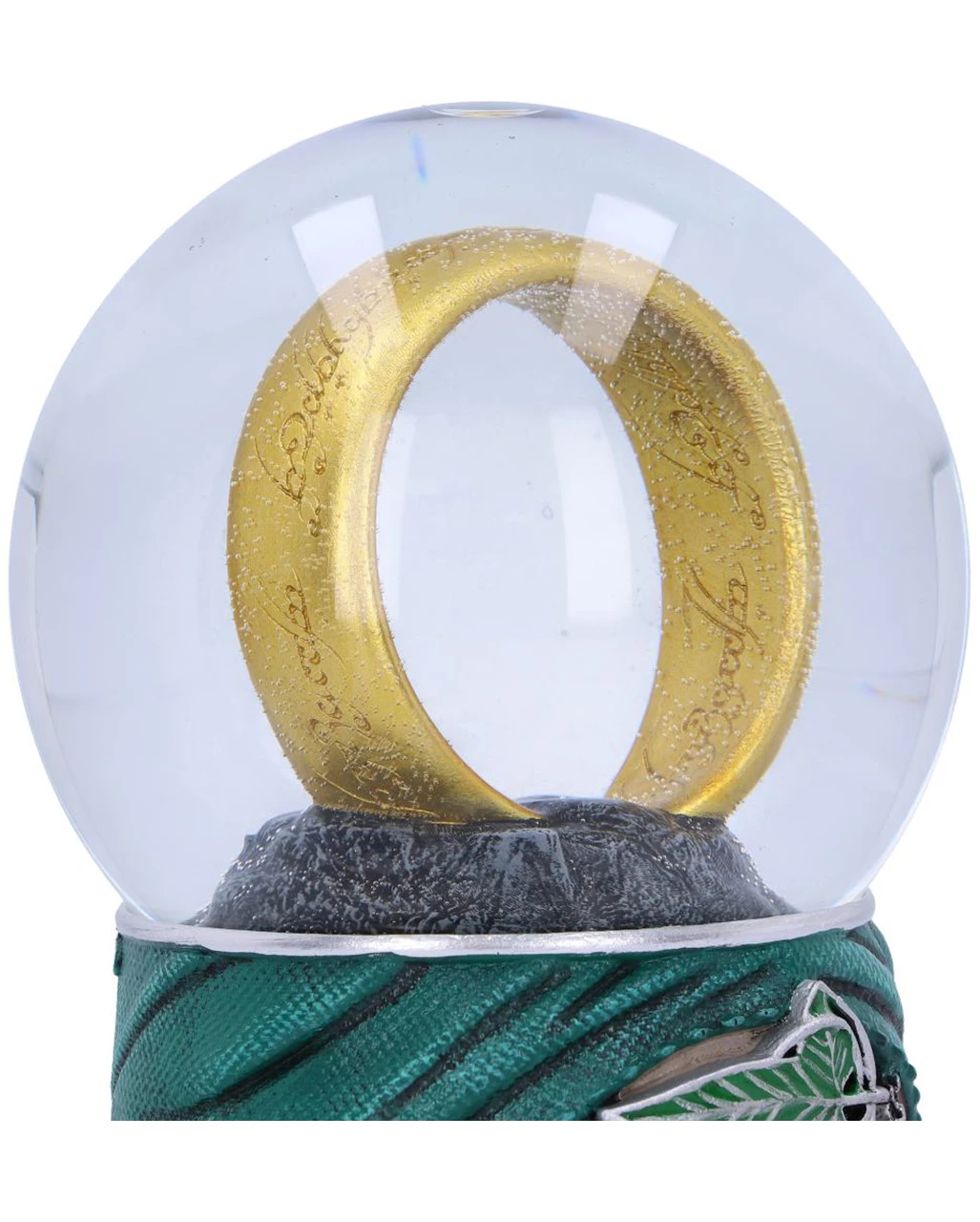 Unsere Lord of the Rings Frodo Schneekugel zeigt Frodos grünen Umhang. Seine Vorderseite zeigt den geknöpften Blazer und ein cremefarbenes Hemd. Das ikonische Blatt von Lorien ist unter dem oberen Rand platziert und bildet das perfekte Mittelstück. Auf der Rückseite dieser Herr der Ringe Schneekugel prangt der Spruch „Auch die kleinste Person kann den Lauf der Zukunft verändern“.